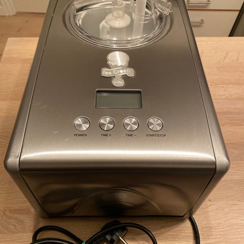 Wilfa ismaskine i rustfrit stål med digitalt kontrolpanel og gennemsigtigt låg. Maskinen har ventilator til køling og er designet til hjemmebrug til fremstilling af is.Kun brugt meget få gange