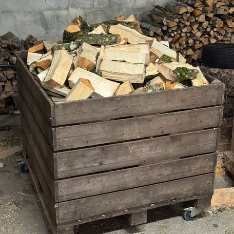 Er kløvet og står inde. Det er tørt og klar til brug.