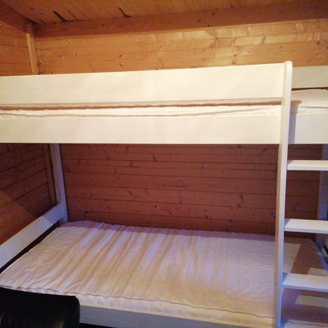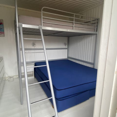 Hvid køjeseng med madrasser. Sengen har tre sovepladser, en øverste og to nederste, alle med tilhørende madrasser. Stige medfølger. Velegnet til børneværelse eller gæsteværelser, eller som hos os, i sommerhus