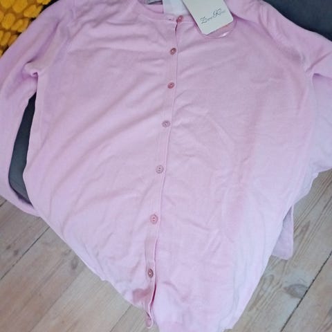 Rosa cardigan med pailletter.den har lidt rib effekt nederst og er lidt tætsiddende.