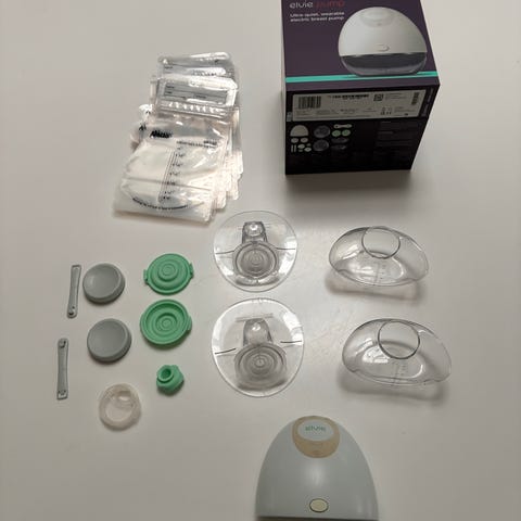 Elvie Pump brystpumpe med bærbar og lydløs funktion. Produktet inkluderer flere tilbehørsdele til pumpebrug og opbevaring. Designet til diskret og praktisk amning.