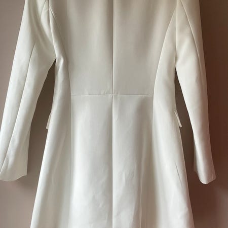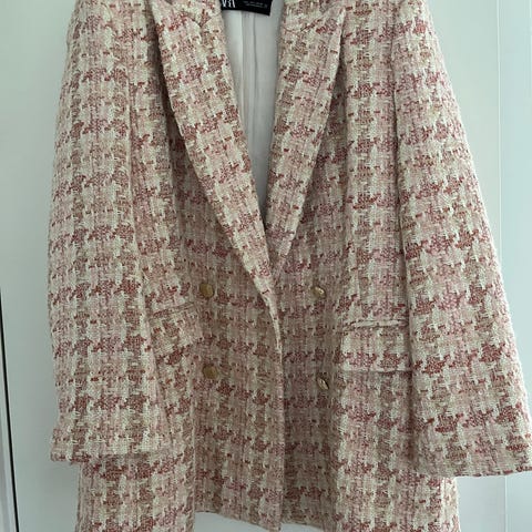 Elegant hvid blazer/jakke fra Zara TRF (Trafaluc) med flot struktureret mønster i stoffet. Jakken har rund hals og lynlåslukning foran samt en let figursyet pasform, som giver et feminint og stilrent look. OBS: Mærket er str. S, men fitter lille. Jeg bruger selv str. S, og denne er tydeligt for lille til mig – derfor anbefales den til XS.