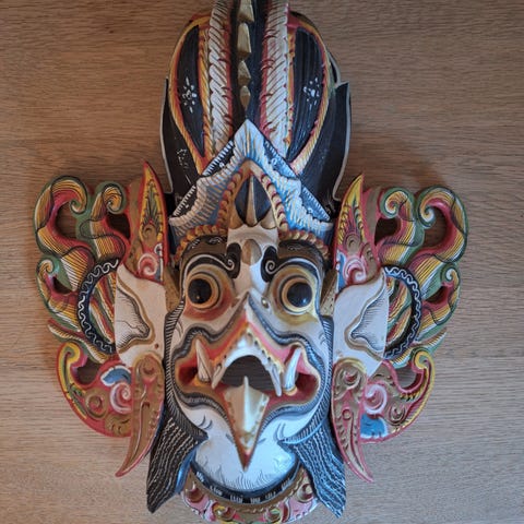 Træudskåret vægdekoration med motiv af et ansigt. Fremstillet i mørkt træ med detaljeret udskæring, der viser ansigtstræk og ornamentik. Velegnet til vægophæng som dekorativt element.