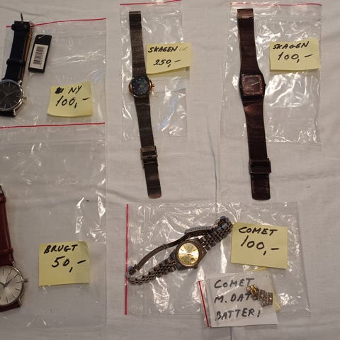 smykker til kvinde fremstillet i stål. indeholder flere forskellige ure,runde og med stål rem. De virker men mangler batteri.pr. Stk 50kr Ur nr 2 fra højre er solgt.