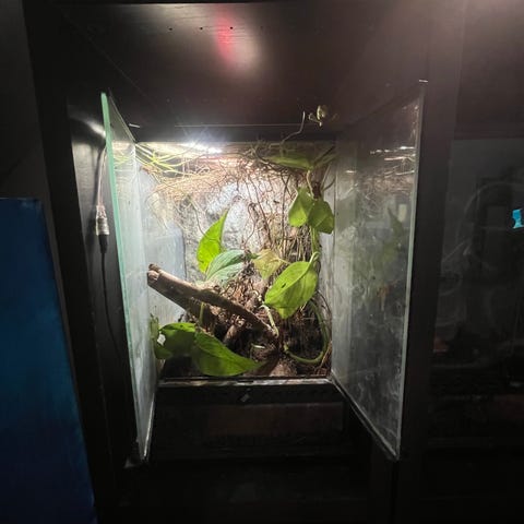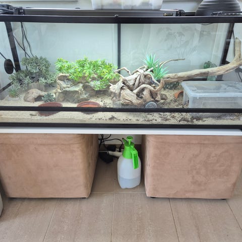 Terrarie med uv/varme, ca. 20 stks gekkoer og en bøtte mad.