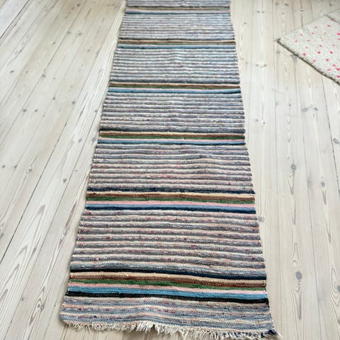 Et dobbeltvævet tæppe i flotte farver. Tæppet har frynser. Forskellige mønstre på begge sider. Vintage