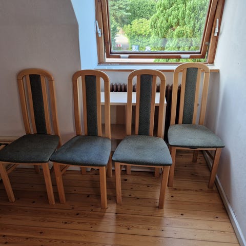 4 stk super fine stole i grå stof og træ ben.