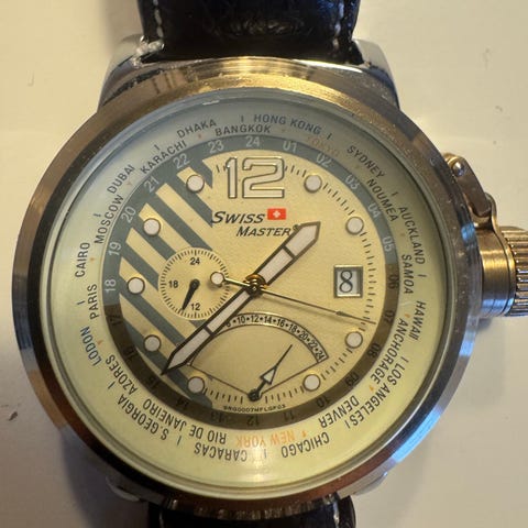 Swiss Military herreur med rund urskive, analog visning og datovisning. Uret har en sort læderrem med syninger og en stålspænde med indgraveret mærke. Urkassen er i rustfrit stål med detaljeret urskive og drejekrans.
