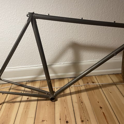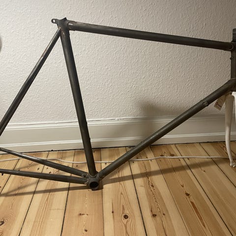 Sandblæst Bianchi ramme til dig der drømmer om at lakere selv. Jeg må erkende at jeg ikke kommer til fuldende projektet. Der er en lille bule på sadelrøret der kan ses på det sidste billede. Planen var at spartle det til inden slibning. Bulen sidder heldigvis på midten af røret, så det kommer ikke til at have indvirkning på sadelpind eller forskifter.