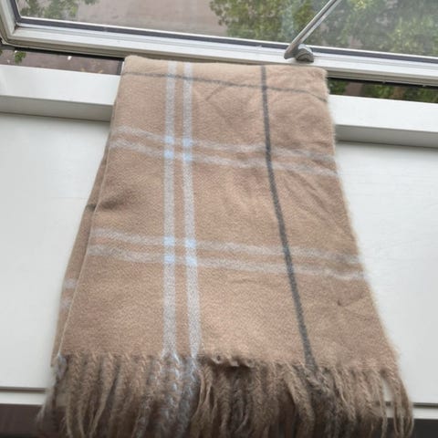 • Materialemærke er klippet af, men tørklædet føles blødt og lunt – tænker der er lidt uld i