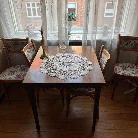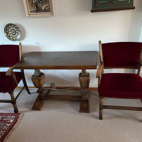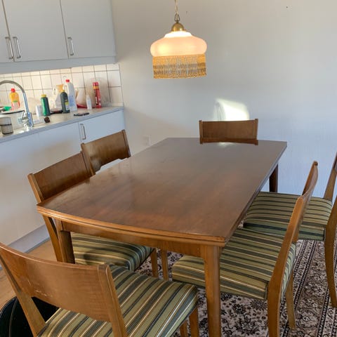 Spisebord med seks stole i rød velour og træ