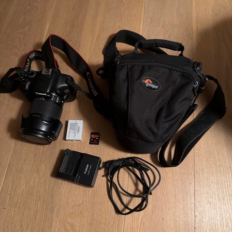 Canon EOS 550D spejlreflekskamera med tilhørende objektiv 18-135 mm (som er tilkøbt som et bedre obejektiv end det der standard fulgte med).