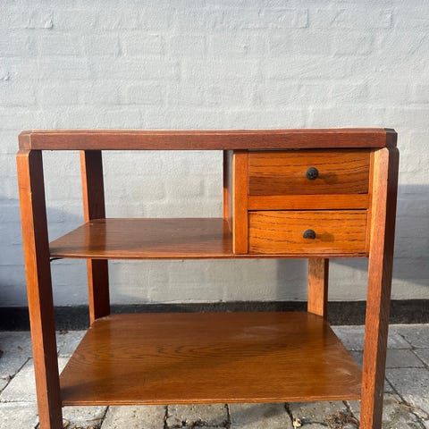 Fint lille telefonbord med kakler. Træet trænger til en kærlig hånd, men eller virkelig charmerende og skufferne virker uden problemer.