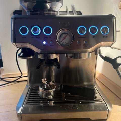 Sage Barista express BES875. Købt i 2021, men kun brugt sporadisk i små 2 år (weekend brug - ikke daglig brug). Blev renset og pakket ned i forbindelse med flytning og blev ikke pakket ud igen pga. præference for 'kapsel'-maskine kaffe.