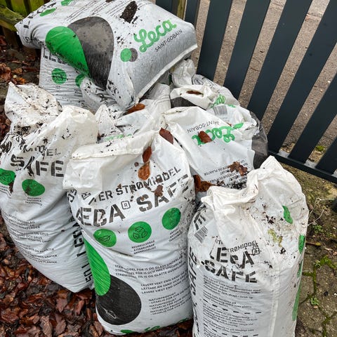 Lecakugler fra hulmur i et hus til fri afhentning. Der er 4 store hvide sække. Skriv en besked for afhentning, så stilles de ud til vejen. Først til mølle.