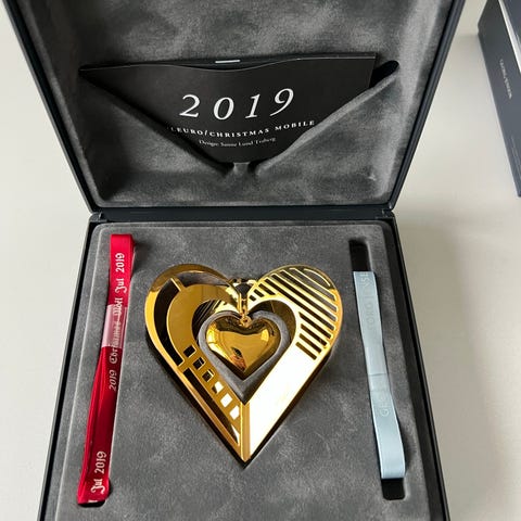 Georg Jensen juleophæng formet som et hjerte i guld og sølv. Designet til jul, dekoration til juletræet eller anden juleudsmykning.