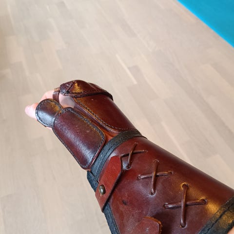 Sværd, rundt skjold og ork-hjelm i kernelæder. Sværdet kommer med en skede i læder og en lang klinge. Skjoldet har en indvendig håndrem i læder. Hjelmen er i tylt kernelæder og kan spændes bagtil. Sættet kan anvendes til rollespil eller udklædning.