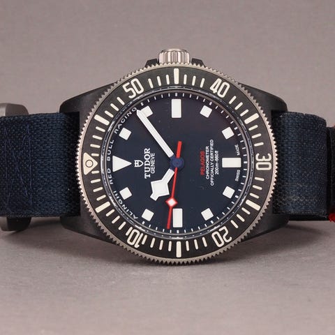 Flot og sporty Tudor Pelagos FXD MN23 i titanium med den flotte blå skive og matchende blå natorem. Modellen er udviklet i samarbejde med den franske flåde Marine Nationale og har faste FXD-lugs for maksimal sikkerhed. Inde i titanium kassen sidder Tudors eget COSC-certificerede MT5602-værk som yder 70 timers gangreserve og en garanteret vandtæthed ned til 200 meter.