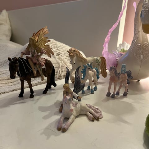 Schleich figurer bestående af forskellige dyr som heste og enhjørninger samt fe-figurer. Figurerne er detaljerede og velegnede til leg og samling.