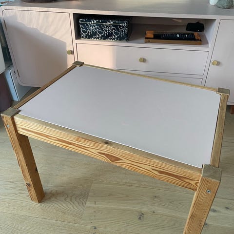Måler 100x60cm og 54cm i højden. Masser af brugsspor, men solidt og man behøver ikke være bange for at de små spilder lim på det.