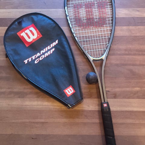 Wilson Titanium Comp squashketcher med cover og squashbold.