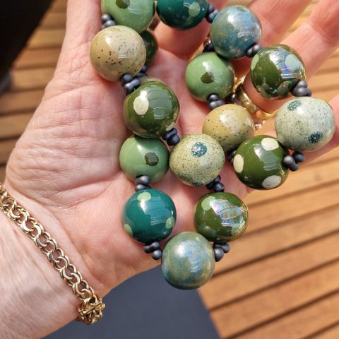 Lang 3-i-1 halskæde + one-size armbånd i koralfarvede glasperler + turkiser