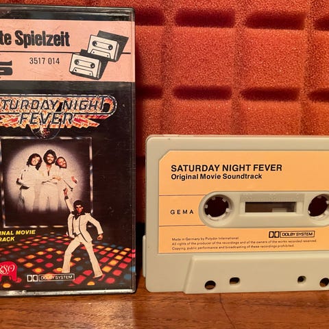 Soundtrack fra filmen Saturday Night Fever på kassettebånd. Indeholder sange som Night Fever, How Deep Is Your Love og Stayin' Alive.