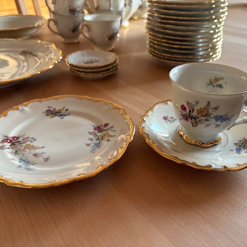 Guldkantet kaffestel. 8 kopper, 10 tallerkner, 3 fade. Arvestykke