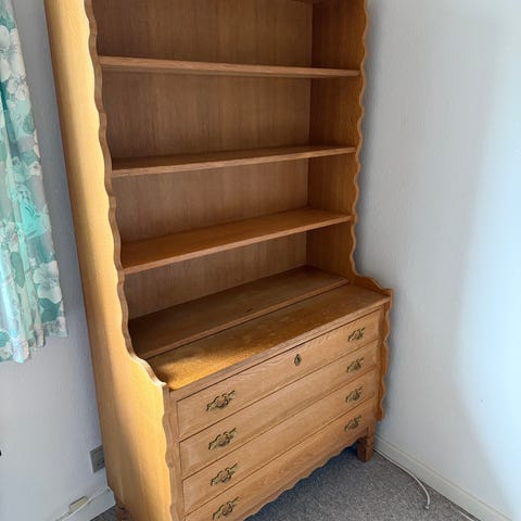 Fin reol i egetræ, pladen i toppen kan trækkes ud til skrivebord. Træet trænger til en kærlig hånd, ellers fint.
