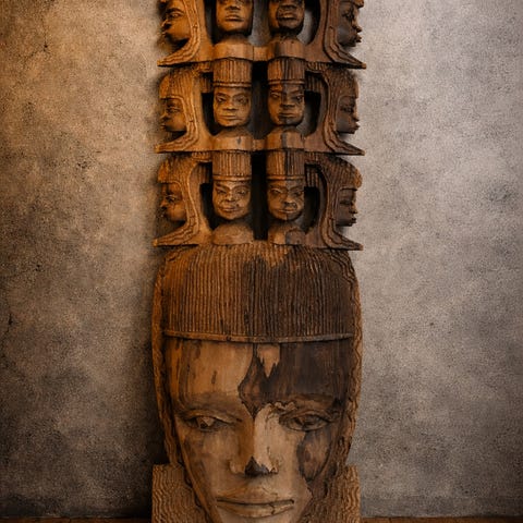 Stor, håndskåret og håndmalet træskulptur/vægrelief med masser af fine detaljer og ornamentik i farverne rød, blå og gul. Figuren forestiller en karakter med flere arme, iført traditionelt tøj og hovedbeklædning, indrammet af en rigt udskåret ramme. Et markant statement-piece til indretningen.
