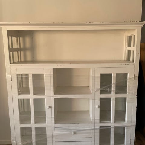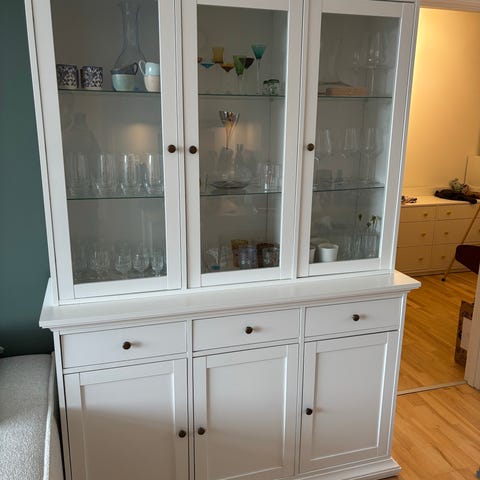 Smukt hvidt vitrineskab i træ og glas. Kan bruges mange steder i hjemmet.