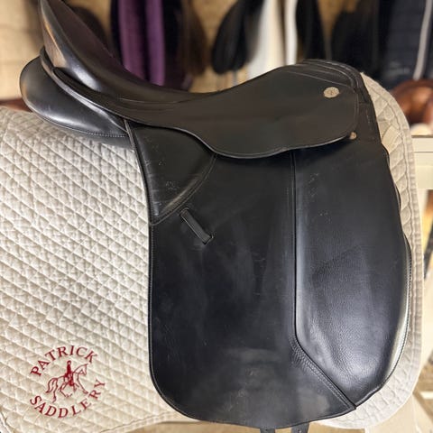 Sjældent udbudt dressursadel fra Kieffer og modellen Marzog. Den er 17" og fit 3. Den er chokoladebrun og sort. Der er mulighed for nemt at regulere størrelsen på knæstøtten.