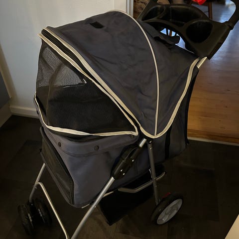 Klapvogn til hvalpen eller den gamle hund der ikke længere kan gå så langt. Max vægt 10-12 kg. Kun brugt få gange til vores gamle hund. Stoffet er åndbart takket være netvinduet, og vognen kan foldes sammen for nem opbevaring og transport.