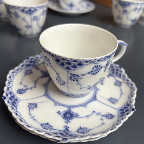 Royal Copenhagen Musselmalet tekop med underkop i porcelæn. Tekoppen har det klassiske blå og hvide Musselmalet mønster, kendt for sine detaljerede blomstermotiver og blå farve. Sættet består af en kop og en tilhørende underkop, velegnet til servering af te.
