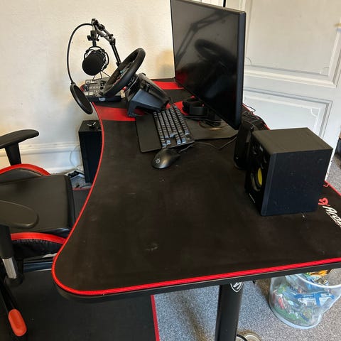 Rigtig lækkert gamerbord med mussemåtte på hele pladen, bordet måler 160x80 cm og er ca. 80 cm i højden, rengøres selvfølgelig inden salg, ingen huller i måtten, pæn stand, fra ikke ryger hjem, kun afhentning, billigste nypris på nettet er 2299,-