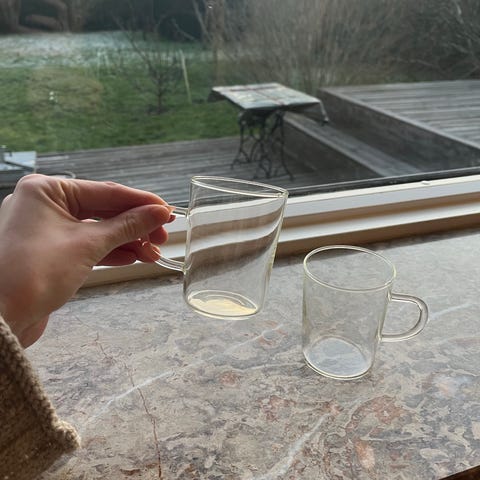 Hay kopper sæt. Kopperne har et enkelt design og er velegnede til daglig brug i køkkenet.