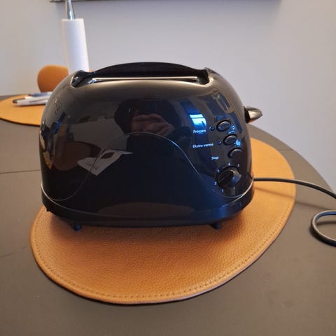 Point Brødrister med plads til 2 skiver. Farve: hvid. Materiale: plastik og metal. Designet til opvarmning og ristning af brød.