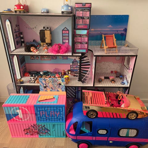 L.O.L. Surprise legetøjssæt bestående af en legetøjsbil med plads til to sæder, en containerformet legehusstruktur med flere rum. Huset kan slås ud og pakkes sammen, der er masser af tilbehør samt en samling af små dukker med tøj og diverse dimser.. derudover også nogle større LOL-dukker med serveres tøj. Der er mere tilbehør end på billederne