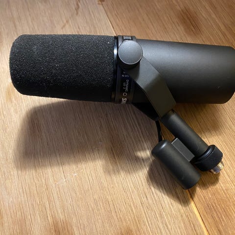 Shure SM7B mikrofon med tilhørende arm og klemme til montering. Mikrofonen er velegnet til optagelse og broadcasting. Arm og klemme giver fleksibel placering og stabilitet ved brug.