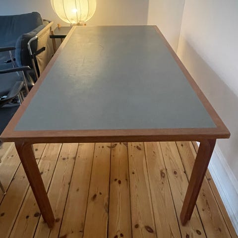 Smukt spisebord, perfekt egnet til den mindre lejlighed. Minder om Magnus Olesen og Alvar Aalto med sit forspændte bøg og farvede linoleums bordplade.