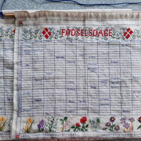 Navneklude/fødselsdagskalender. Håndarbejdets Fremme. Ida Winkler m.fl.