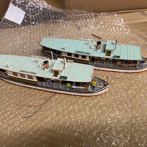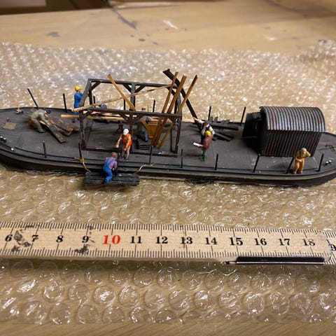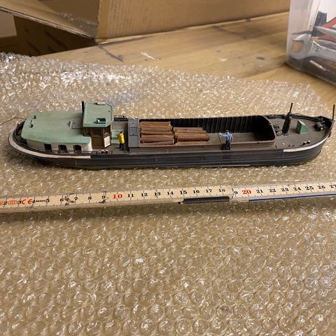 Model Skib med last, fremstillet i materialer som resin og plastik, med detaljer som skibshus og last i form af rør.