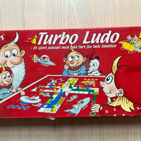 Turbo Ludo brætspil med tema om sjov og familieunderholdning. Spillet indeholder farverige illustrationer og er designet til at skabe hurtig og underholdende spiloplevelse for flere spillere.