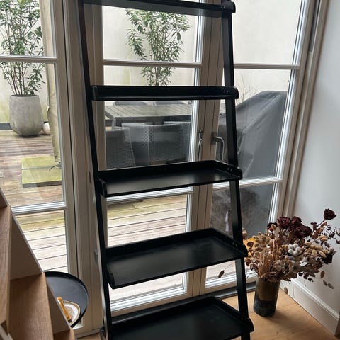 Super fin skrå stigereol. Brugt på badeværelse. 16 cm oppe og 34 cm nede i dybden (selve hylden)