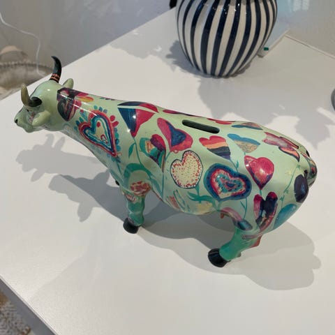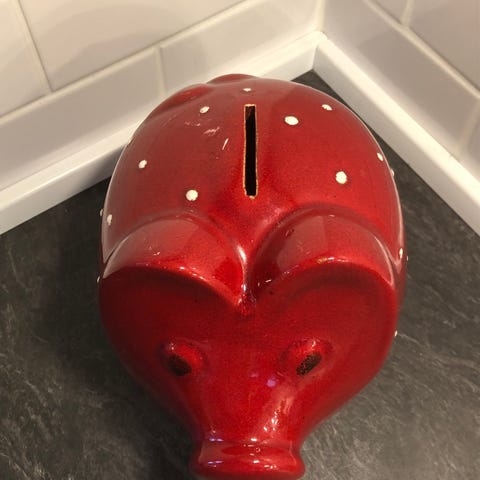 Asgaard Denmark penguin sparegris i keramik med rødt strikket tørklæde. Sparegrisen har en nøgleåbning i bunden til at tømme mønter. Designet som en pingvin med sort og hvid farvetone.