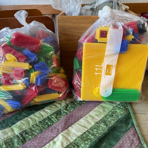 Briste Blocks byggeklodser, bløde piggede overflader som nemt kan sættes sammen. Stimulerer taktik sans og finmotorik. Der er hjul, plade, hoveder, runde ,trekanter og firkanter