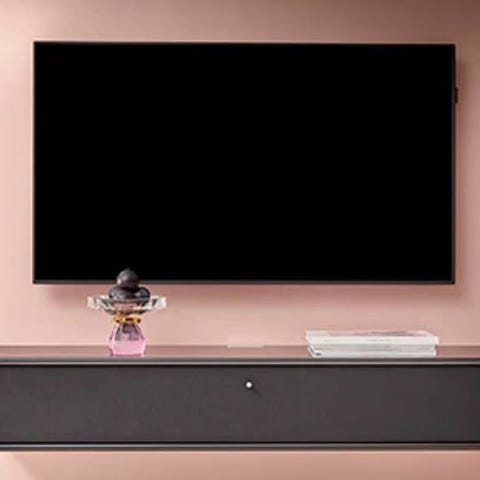 Den kan både monteres på væg og stående, da den har hjul kan den nemt flyttes til rengøring osv. Se billeder for brugsspor - der er blevet skåret et hul bagved for kabelstyring.