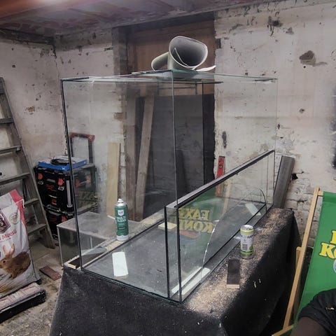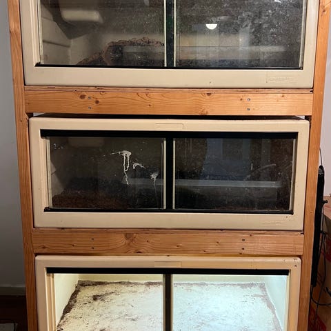 2 stk. store glas terrarier (90 x 60 x 90 cm) med hul i bund til dræn (dræn kan evt medfølge) og 3 huller i top til evt vandingsystem. Rustfrit fluesikkert net i front og i top. Terrarierne har aldrig været i brug og står stadig sprit nye.