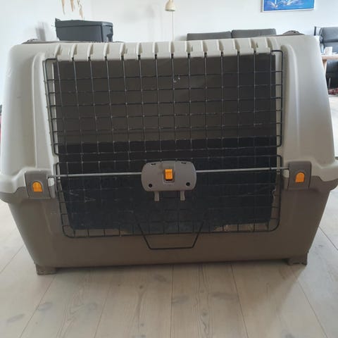 Skudo transportkasse (ca. 60×40×48 cm) med metaldør. Næsten som ny – meget få/ingen brugsspor. Solid og nem at bære, god til hund/kat. Afhentes.
