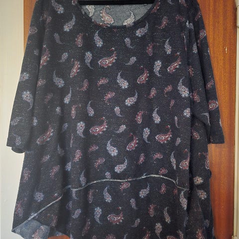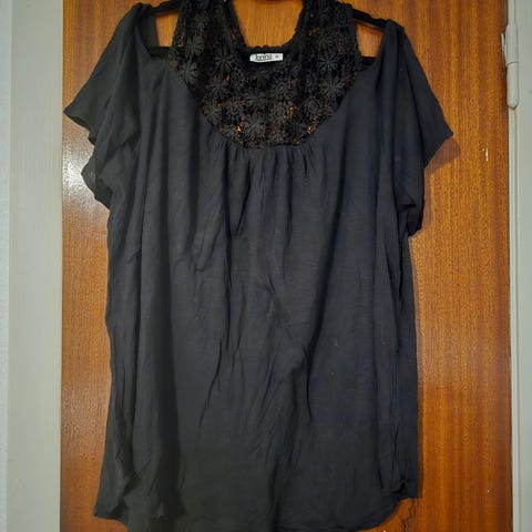 Grå bluse med korte ærmer og en rund halsudskæring med bindebånd. Blusen har en løs pasform.